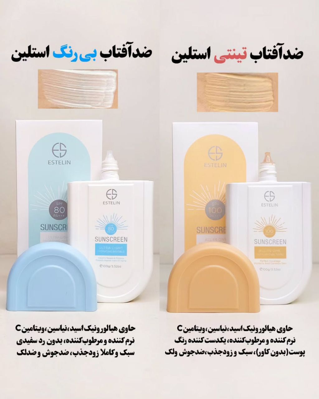 ضدآفتاب بیرنگ و تینتی استلین حجم 100میل spf80 و spf100 بافت سبک و زودجذب کاملا بیرنگ فینیش نهایی مات مناسب همه نوع پوست آبرسانی بشدت بالا جلوگیری از پیری پوست جوانساز ضدپیری محافظت بالا کیفیت فووق العاده عالی